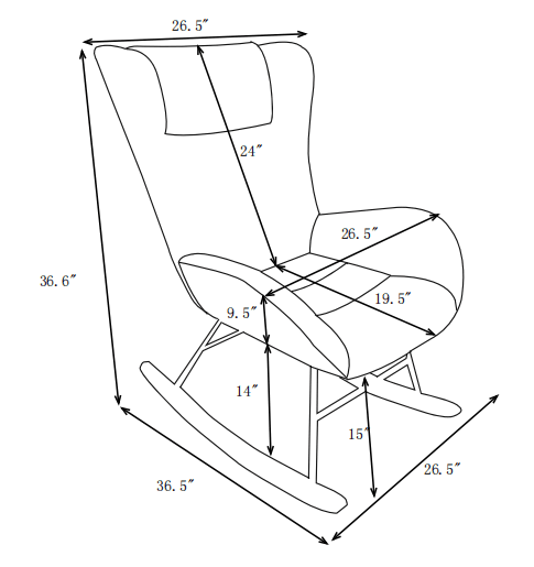 Products SizeW26.5"×D36.5"×H36.6"Seat Height20.4"Seat depth19.6"Seat Width17.3"Arm Height23.5"Arm Depth19.5"Back Height - Seat to Top of Back24"Net weight / Gross Weight20.46LB/23.54LBFeet materialRubber woodUpholstery MaterialTeddy fabricProduct TypeRocking chairFrame MaterialIronSeat Fill MaterialSpongeWeight Capacity220LBAssembly Required:Yes